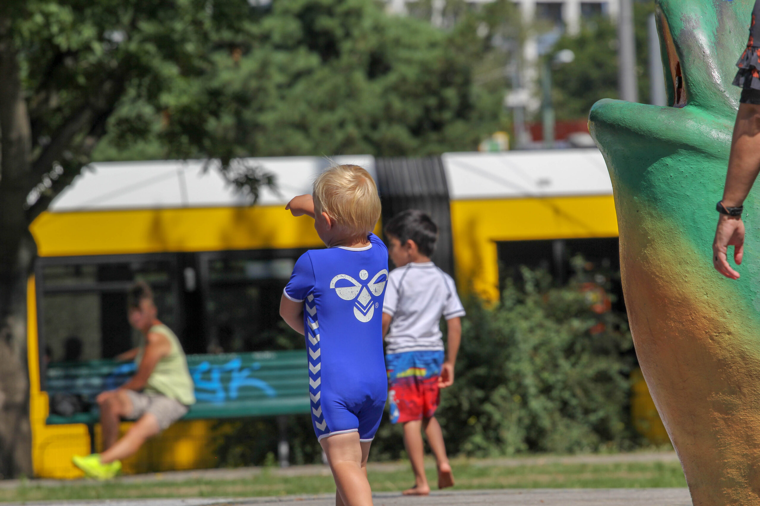 Efter første dag med varm tur i zoologisk have, fortsatte vi de varme temperaturer dagen efter. Vi startede dagen med at tage mod Kolwitzplatz, hvor vi gjorde dagens første stop på én af Berlins mange mange legepladser. Du kan næsten ikke komme forbi et gadehjørne hvor der ikke lige er en legeplads, stor eller lille. Nogle legepladser har endda en masse vandaktiviteter som kan give børnene en velfortjent afkøling i varmen.